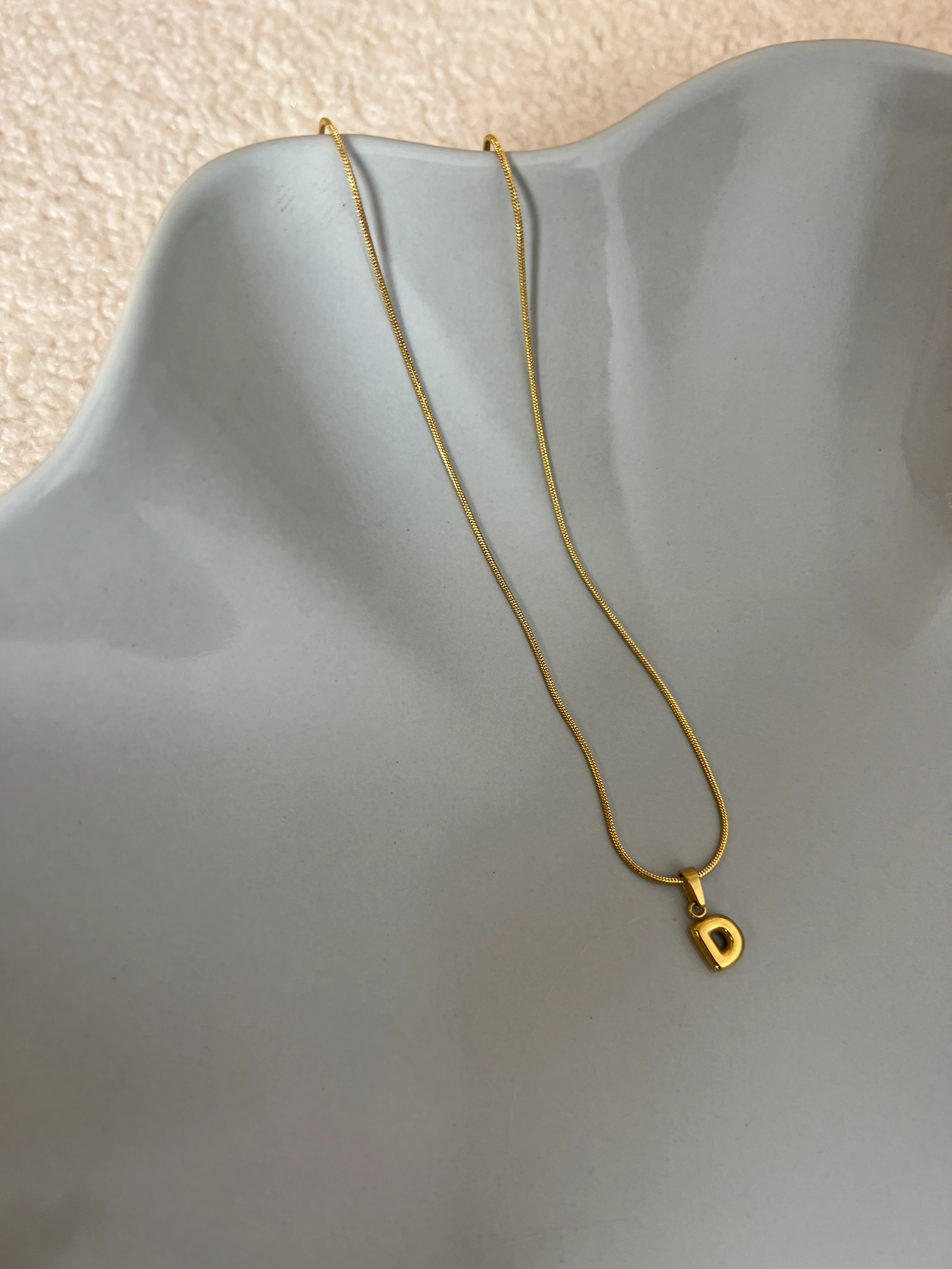 18k gold plated Stainless Steel Puffy Initial pendant on 16" with 2” extender thin minimalist thin snake chain.