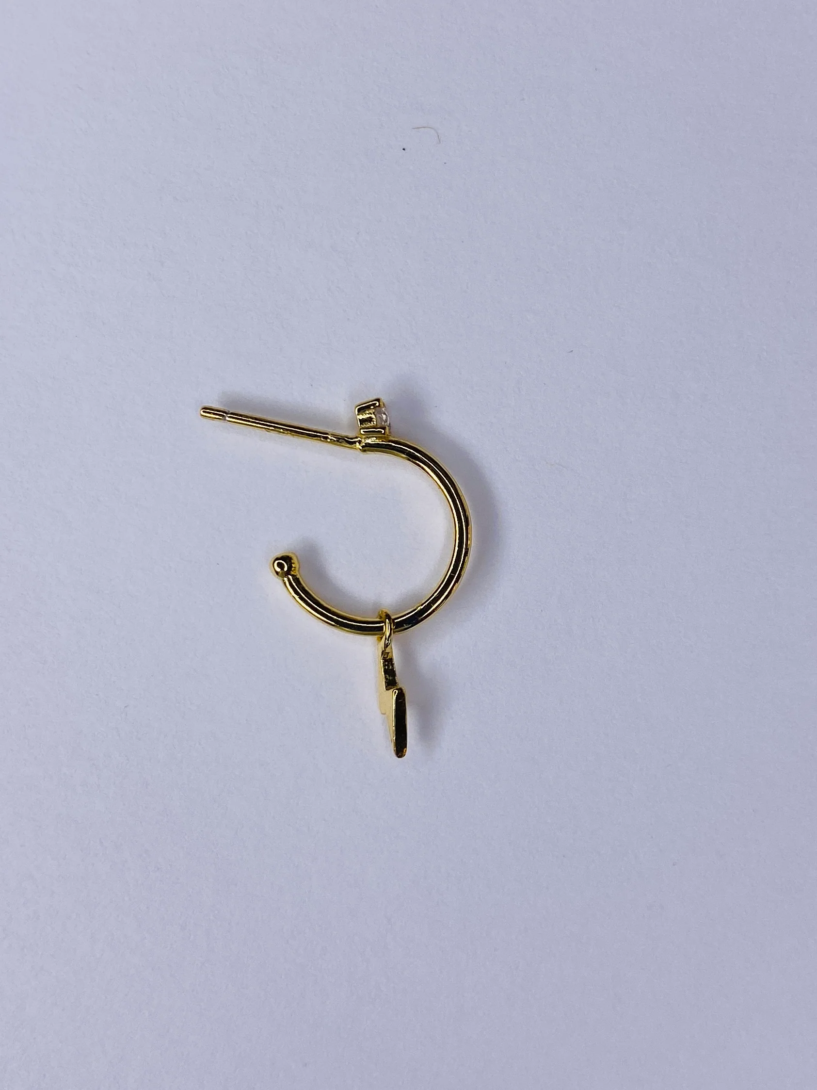 Sterling silver open hoop stud w dangle lightning bolt. 1/2"" diameter x 7/8" length. 14k gold plate or rhodium plate.